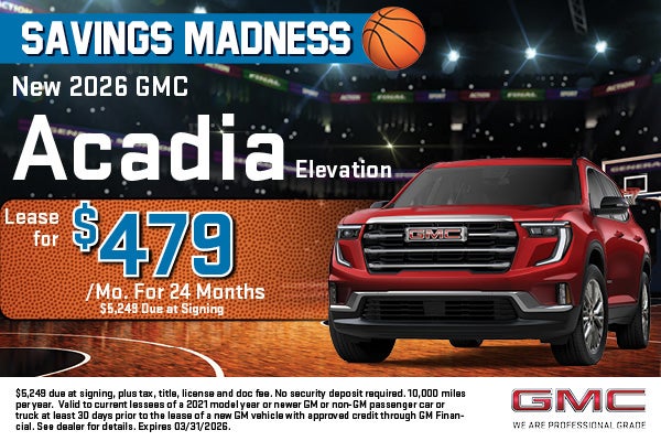 Lease a new 2026 GMC Acadia Elevation for $479 per month for 24 months with $5,249 due at signing.
