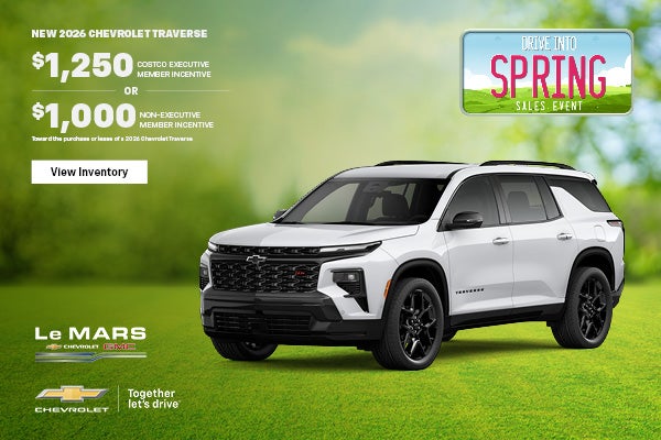 At Le Mars Chevrolet GMC, the difference is that we offer a transparent purchase experience. All prices are plus tax, tag, title, registration, any dealer-installed accessories and dealer provided benefits, and $180 documentation fee. All prices, specifications, and availability are subject to change without notice. Contact dealer for most current information. All advertised pricing is on in-stock units only and includes all applicable dealer discounts, manufacturer discounts, and incentives. Certain offers and incentives presume financing through the Manufacturer Captive Lender, subject to approved credit. Should you purchase the vehicle through the use of other funds or through other lending sources, certain offers and incentives may be excluded. Due to supply chain challenges and limited inventory, vehicles may be subject to an additional market adjustment depending on inventory production, availability, and market conditions. Please see dealer for details. MPG Disclaimer: Based on EPA MPG ratings. Use for comparison purposes only. Your actual mileage will vary depending on how you drive and maintain your vehicle, driving conditions, battery pack age/condition (hybrid only), and other factors. EV Range Disclaimer: Use for comparison purposes only. Actual range will vary based on several factors, including temperature, terrain, battery age & condition, loading, use, and maintenance.