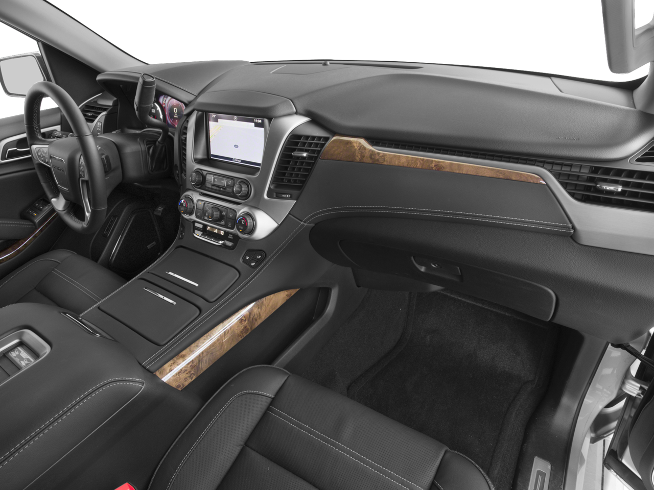 Inside, the Denali cabin is loaded with upscale materials and advanced technology. Features include heated and ventilated front seats, heated leather-wrapped steering wheel, memory seating, power-adjustable pedals, power tilt & telescoping steering column, and genuine wood trim throughout the interior. The power sliding sunroof adds natural light and enhances the premium driving experience.